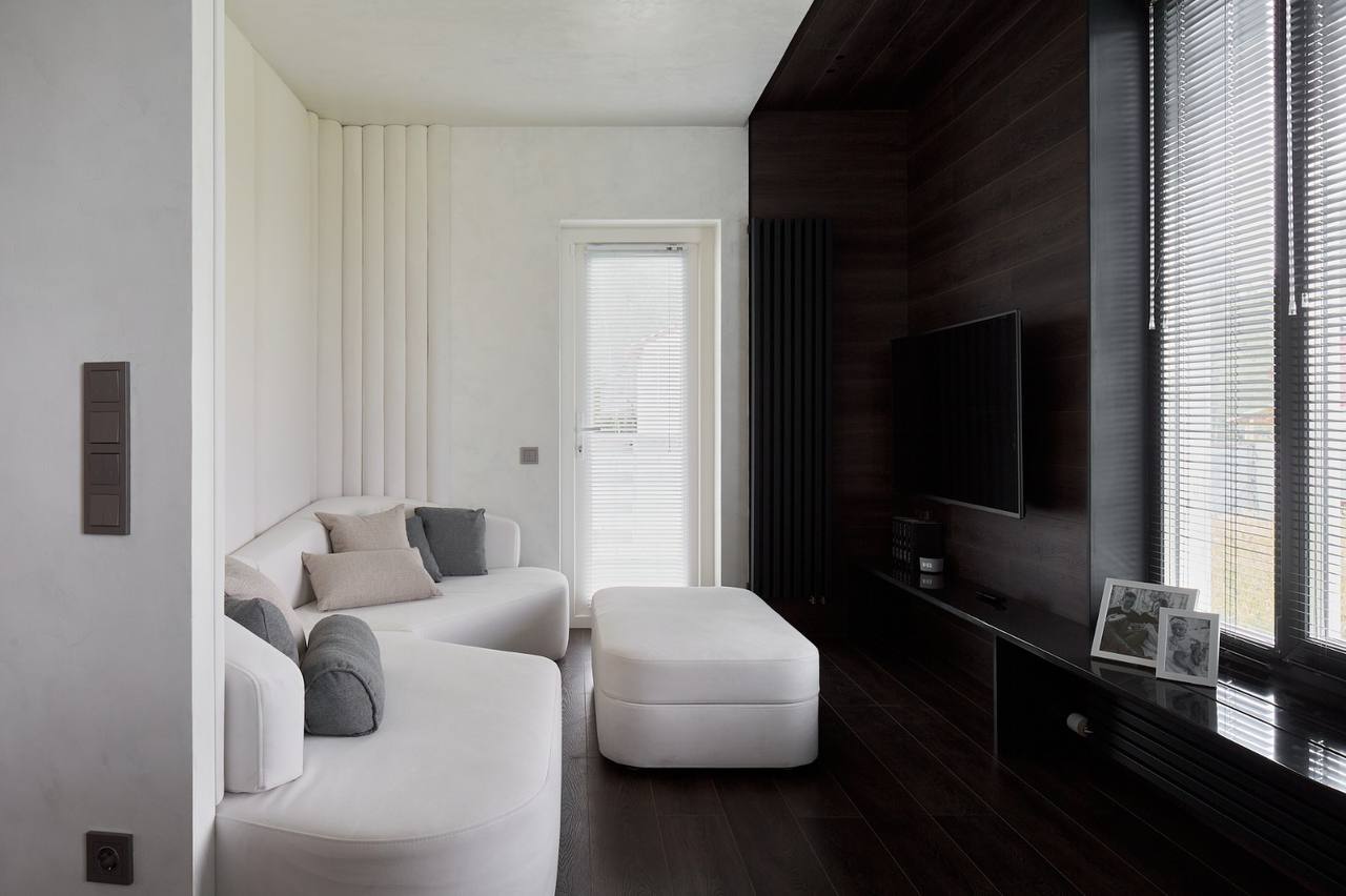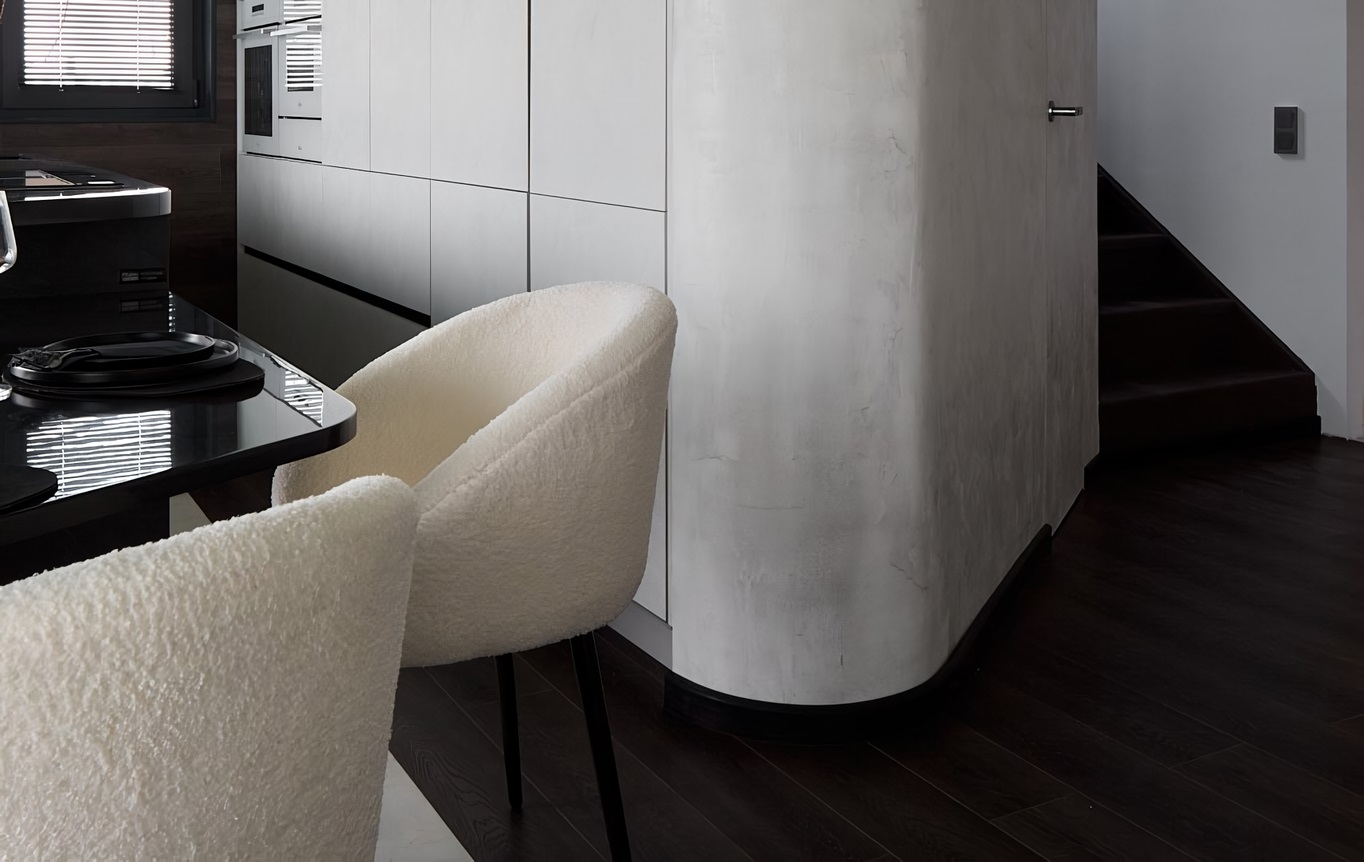 За тёмную сторону отвечал кварцевый ламинат, а для контрастных светлых пятен использовали микроцемент.