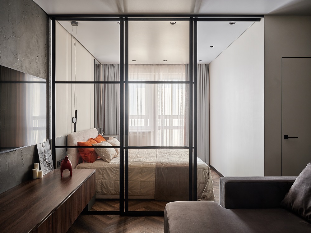 Нейтральные оттенки балансируются целым набором из текстур: ёлочка под дерево, камень, чёрное стекло, деревянные фасады, матовые ткани рисуют объем этой картины.