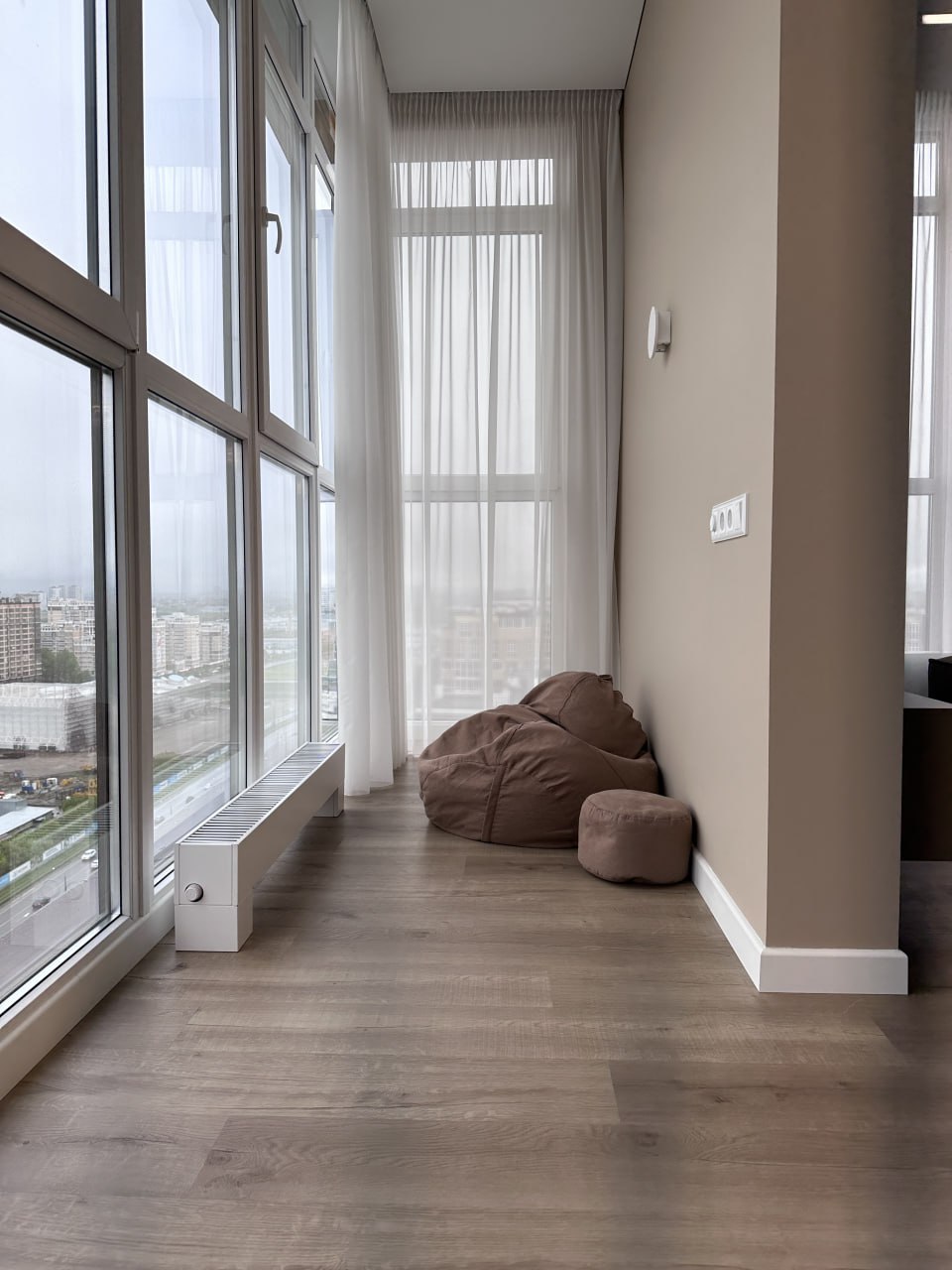 От застройщика был ровный наливной, проблем при укладке не было: сначала положил подложку, потом укладывал кварцевый ламинат. Замки с двух смежных сторон защелкиваются достаточно легко но надёжно, прямые подрезки делал монтажным ножом, фигурные около окна – лобзиком и болгаркой.