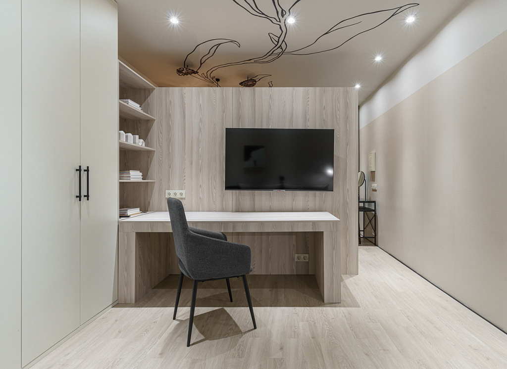 Спальню-гостиную покрасили в бежевый цвет, в центре комнаты возвели стену, а потолок украсила роскошная ветвь. Дизайнеры искали светлый, эстетичный и практичный пол и остановились на кварцевом ламинате Fargo Comfort Ясень Белый JC18001-35.